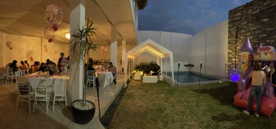 - Alberca, regaderas, vestidores, terraza, jardín, palapa gigante
